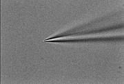 | First the pipette tip is brought into focus. | Then you focus lower through the bath solution; the pipette is temporarily out of focus. | Then you slowly lower the pipette... | until it comes into the current focal plane. You repeat this procedure until the pipette is positioned slightly above the slice. |